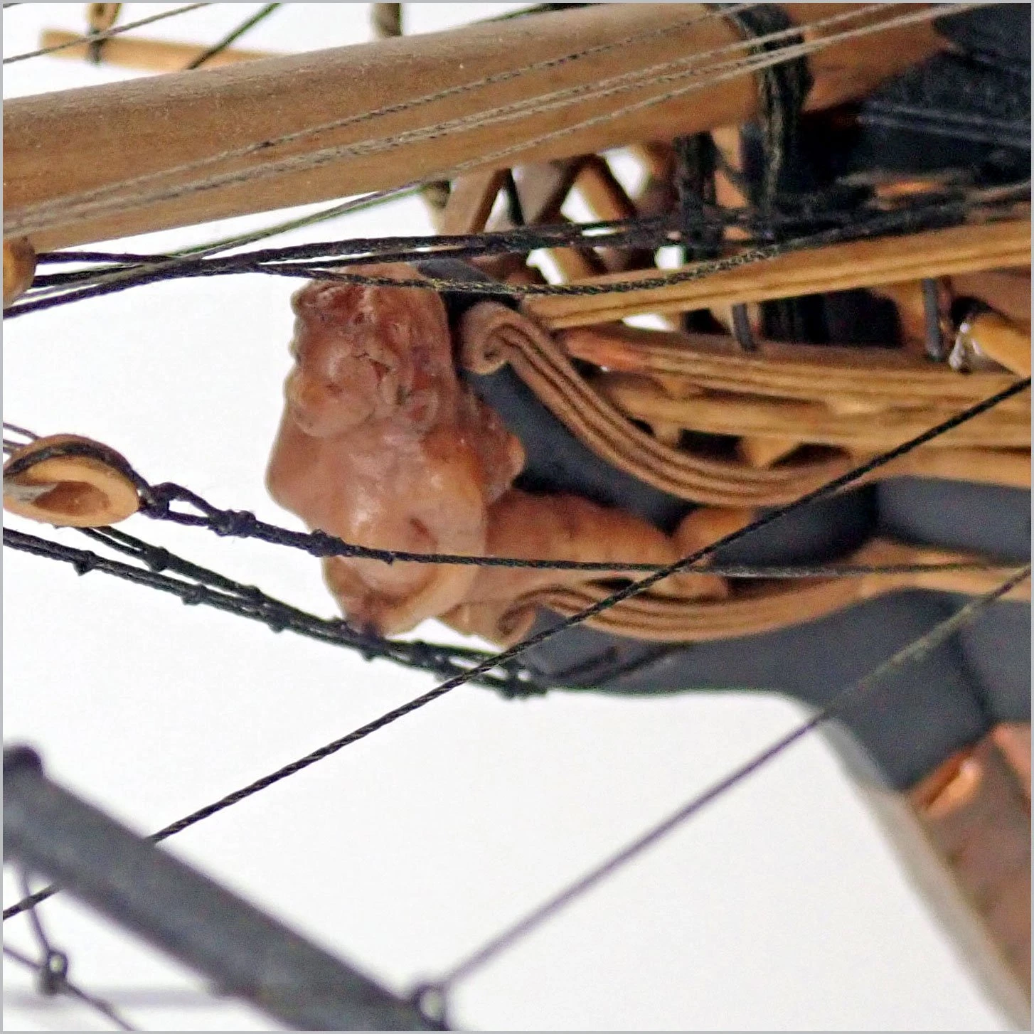 We supply several sizes of basswood strips for deck and hull planking, plus self-adhesive copper tape for plating the hull below the waterline. An abundant fittings package includes photo-etched brass detailing, brass eyebolts, Belaying Pins, nails, gudgeons and pintles, over 200 wooden blocks and deadeyes, gratings, plus dowels for masts and spars. Several sizes of tan and black rigging line, netting, printed flags and grating are supplied as well. Armament consists of 16 precision-cast Britannia metal carronades and two long guns on wooden trucks. The model carries a ship's longboat that's a mini-kit in itself. Actual sized plans are on 8 sheets, and 140-page spiral bound instruction manual shows all stages of construction.